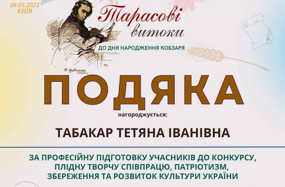 Висловлюємо подяку керівнику – Табакар Тетяні Іванівні, за професійну підготовку учасників до конкурсу, плідну творчу співпрацю, патріотизм, збереження та розвиток культури України.