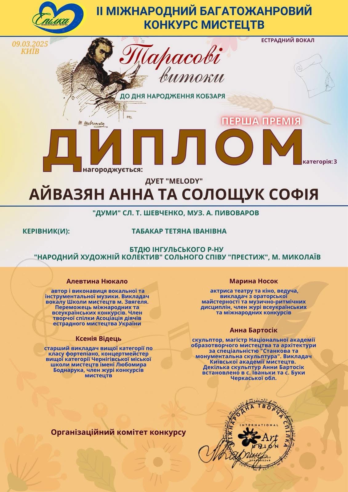 Вітаємо з першою премією дует “Melody” “Народного художнього колективу” гуртка сольного співу “Престиж” (кер. Табакар Т.І.) -Айвазян Анну та Солощук Софію у ІІ Міжнародному багатожанровому конкурсі мистецтв “Тарасові витоки” в номінаціїї “Естрадний вокал” (м. Київ).