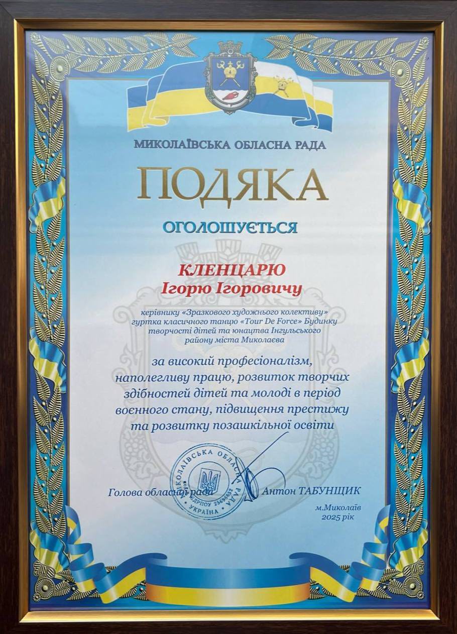 Щиро вітаємо Ігоря Ігоровича Кленцара, керівника “Зразкового художнього колективу” гуртка класичного танцю “Турдефорс” з отриманням Подяки від Миколаївської обласної ради!