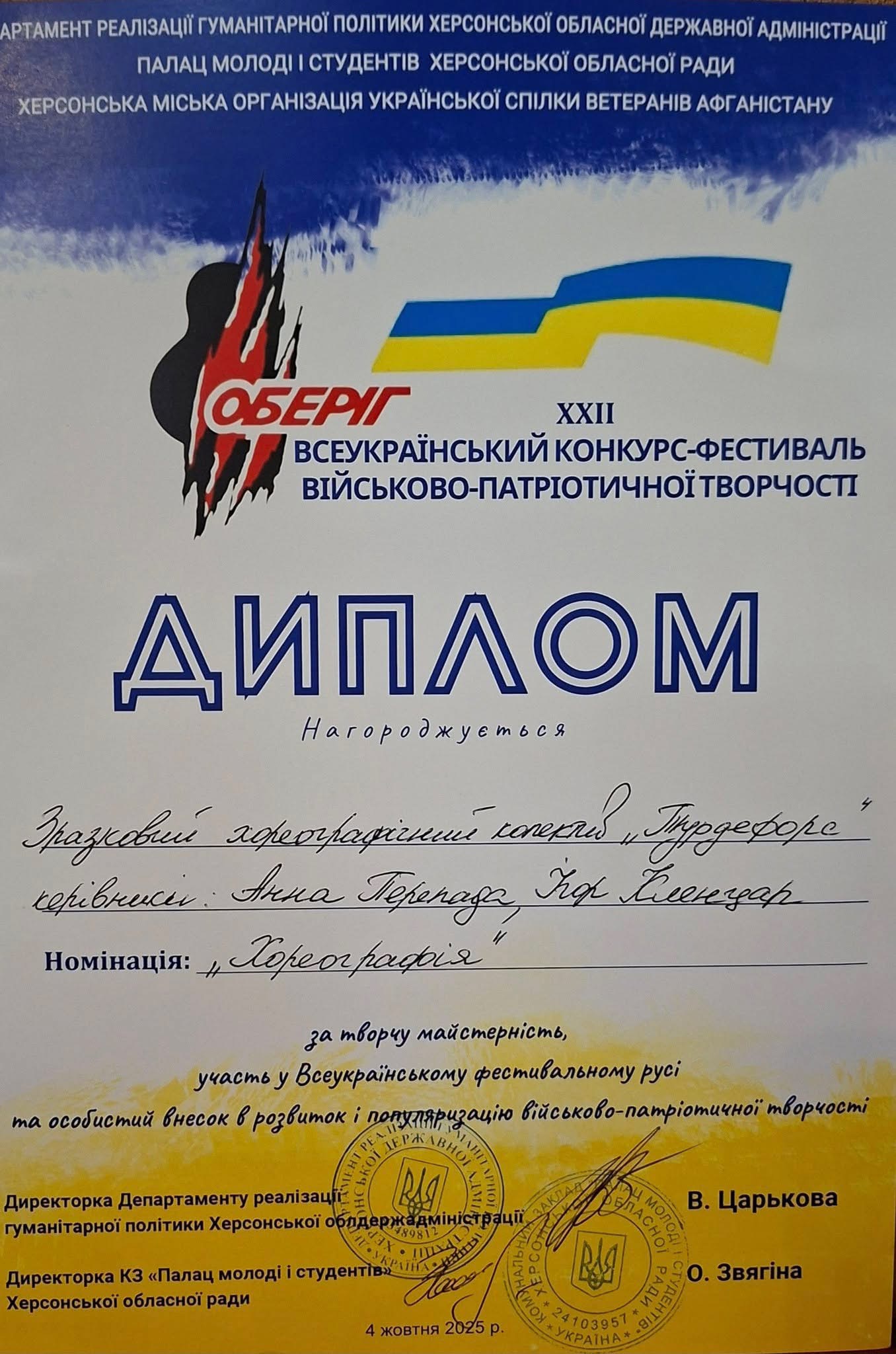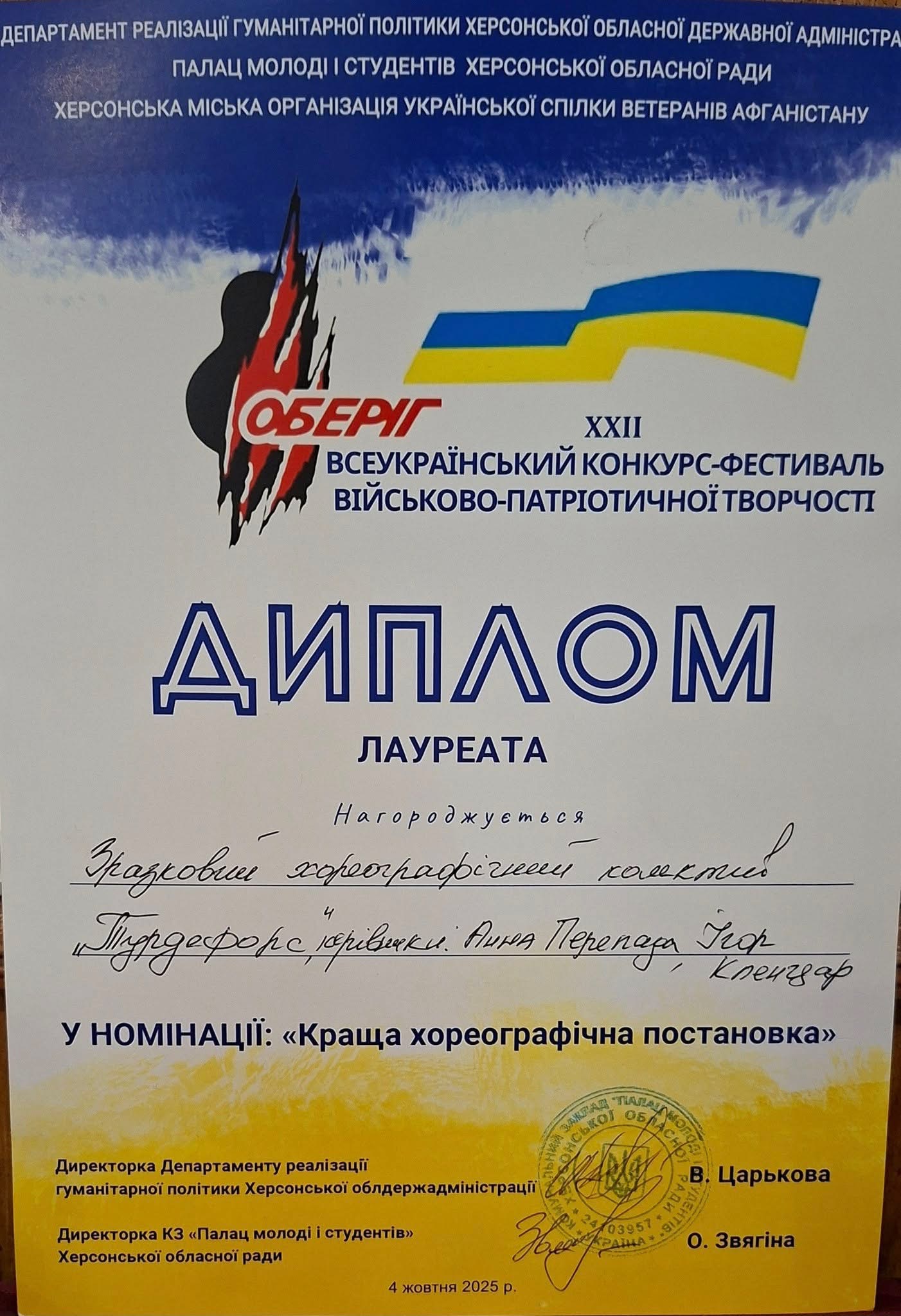 Вітаємо “Зразковий художній колектив” гурток класичного танцю “Турдефорс” (кер. Перепада А.О., Кленцар І.І.) з чудовими здобутками у 12ому Всеукраїнському конкурсі -фестивалі військово-патріотичної творчості “ОБЕРІГ”, м. Миколаїв.