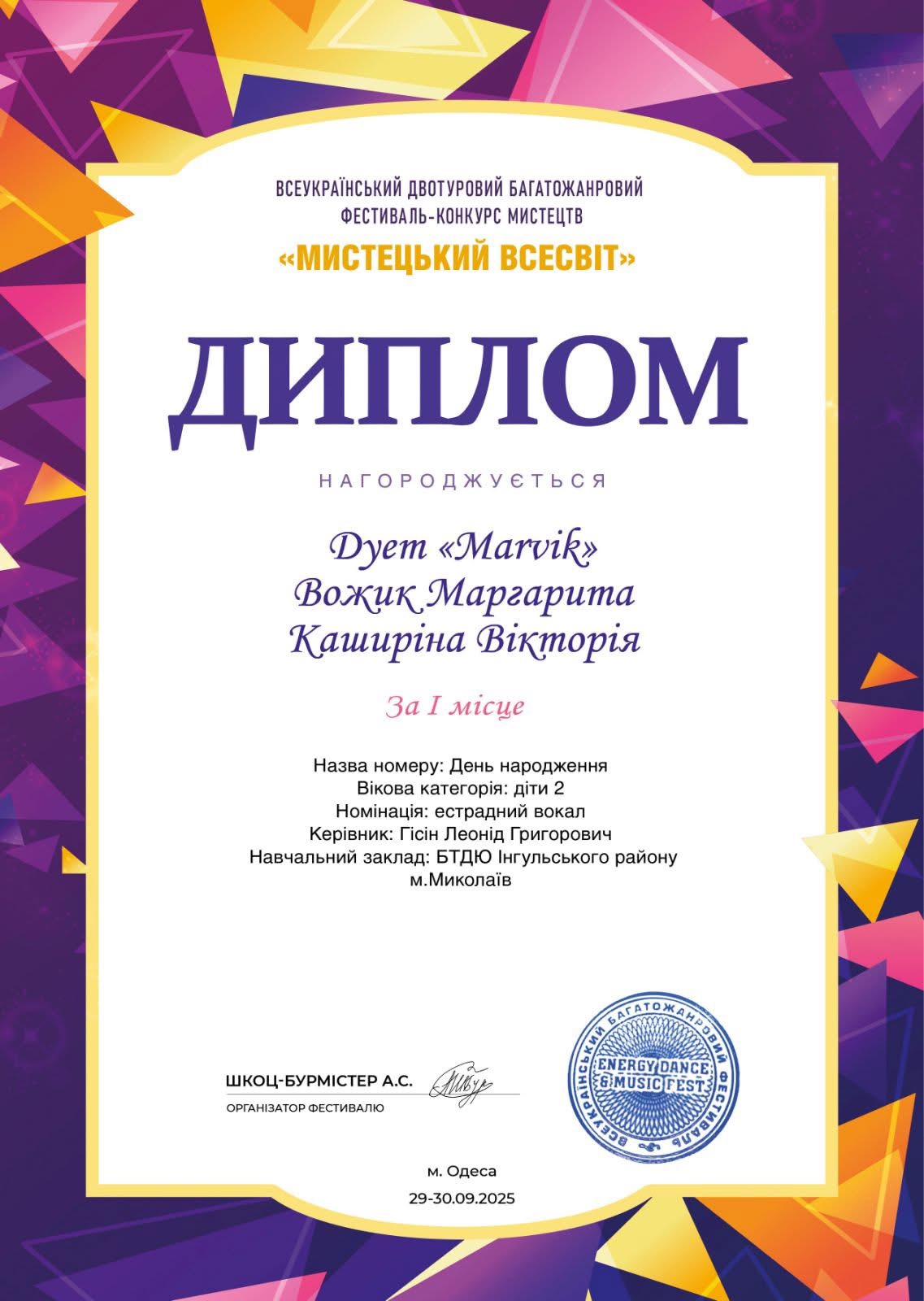 – 1місце – Дует Marvik – Вожик Маргарита, Каширіна Вікторія;🥇