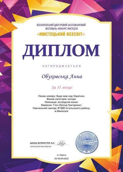 багатожанровому фестивалі – конкурсі мистецтв «МИСТЕЦЬКИЙ ВСЕСВІТ” (м.Одеса)🏆🏆🏆