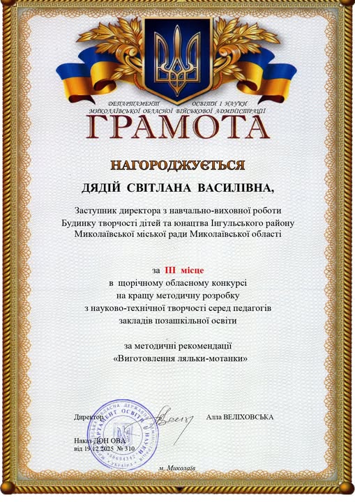 🏆 III місцем у щорічному обласному конкурсі на кращу методичну розробку з науково-технічної творчості серед педагогів закладів позашкільної освіти.