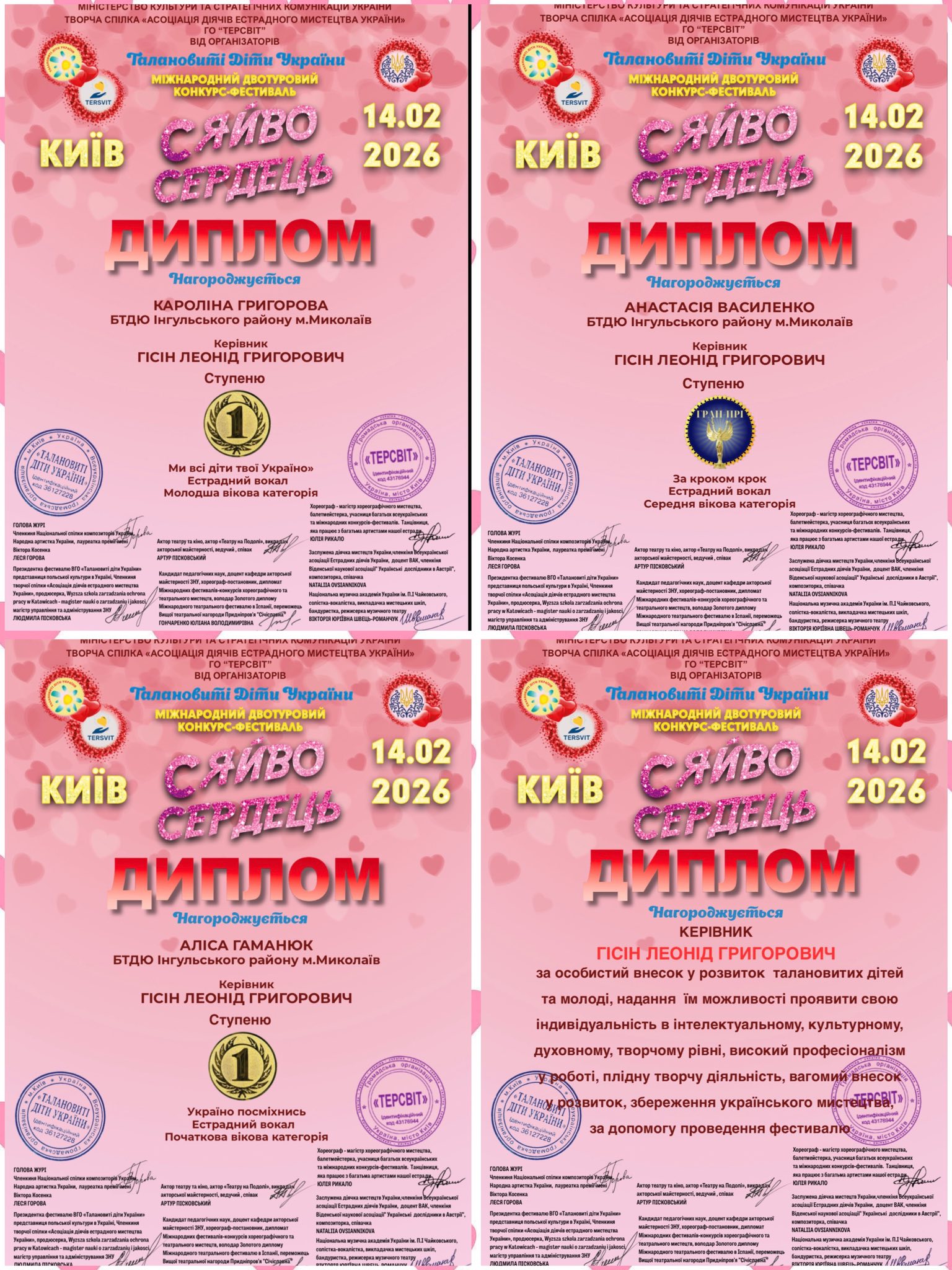 Щиро вітаємо вихованок гуртка сольного співу «Соло», керівник Гісін Л.Г., з блискучими результатами у Міжнародному двотуровому конкурсі-фестивалі «Сяйво сердець» (м. Київ, 14.02.2026), 💖🎶