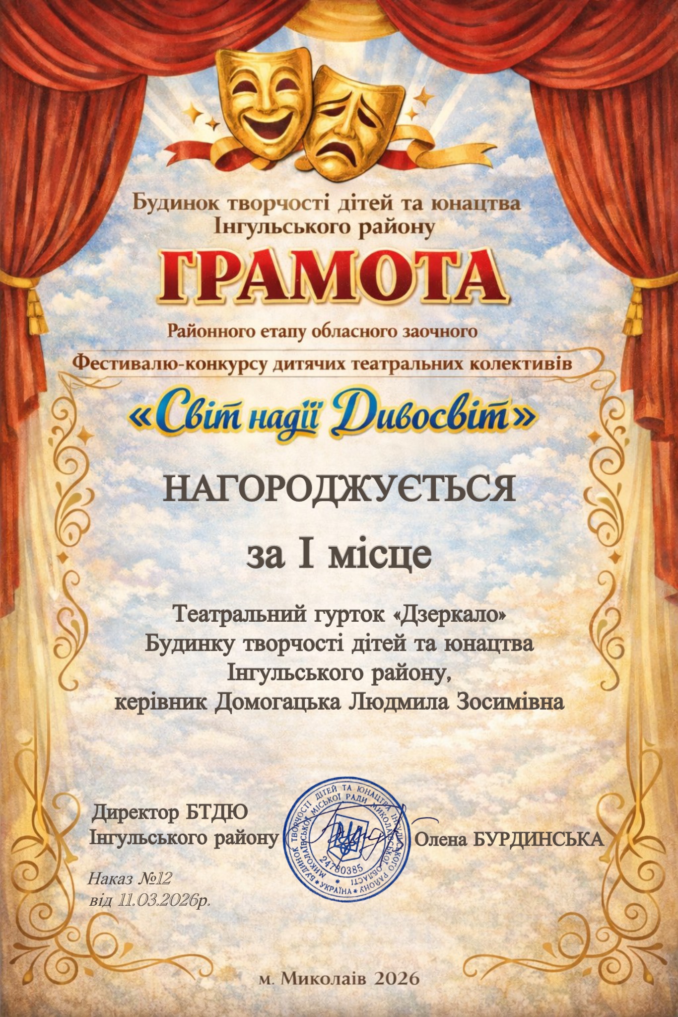 Щиро вітаємо театральний гурток «Дзеркало» Будинку творчості дітей та юнацтва Інгульського району (керівник Домогацька Л.З.) з І місцем у районному етапі обласного заочного фестивалю-конкурсу дитячих театральних колективів «Світ надії Дивосвіт»!