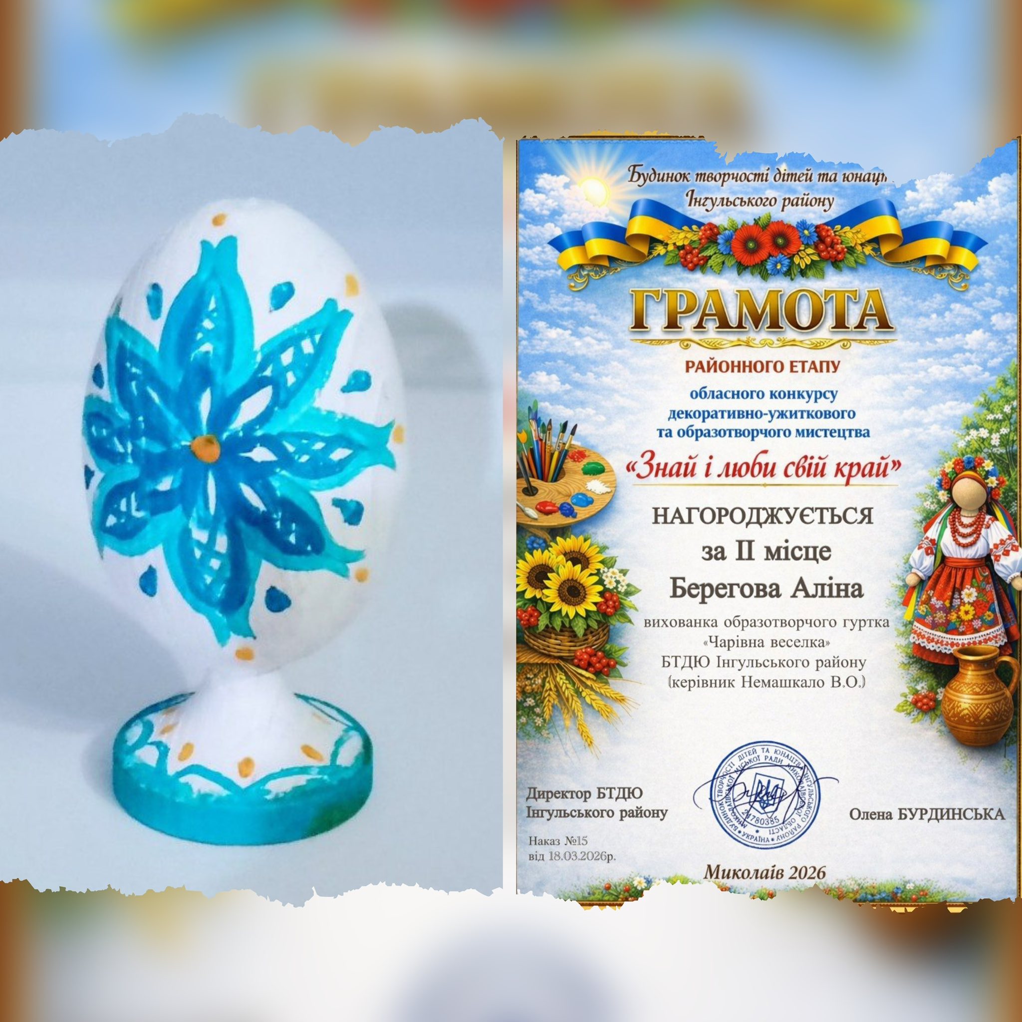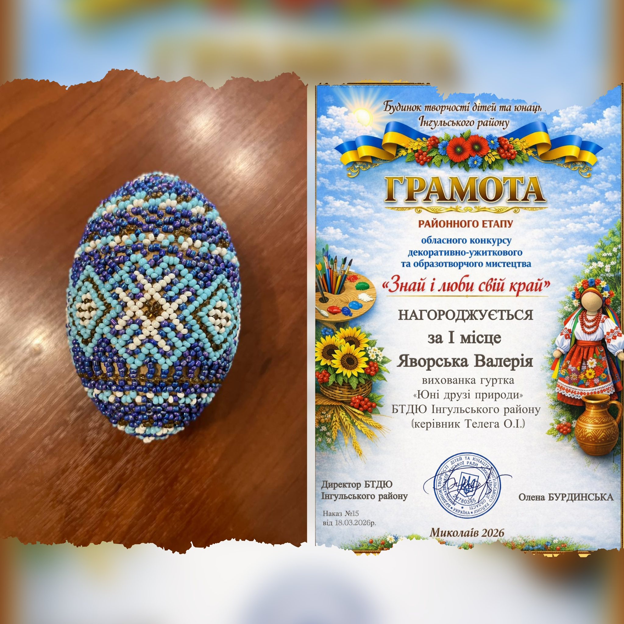 • Яворська Валерія, гурток «Юні друзі природи», робота «Великодня перлина», керівник Телега О.І.