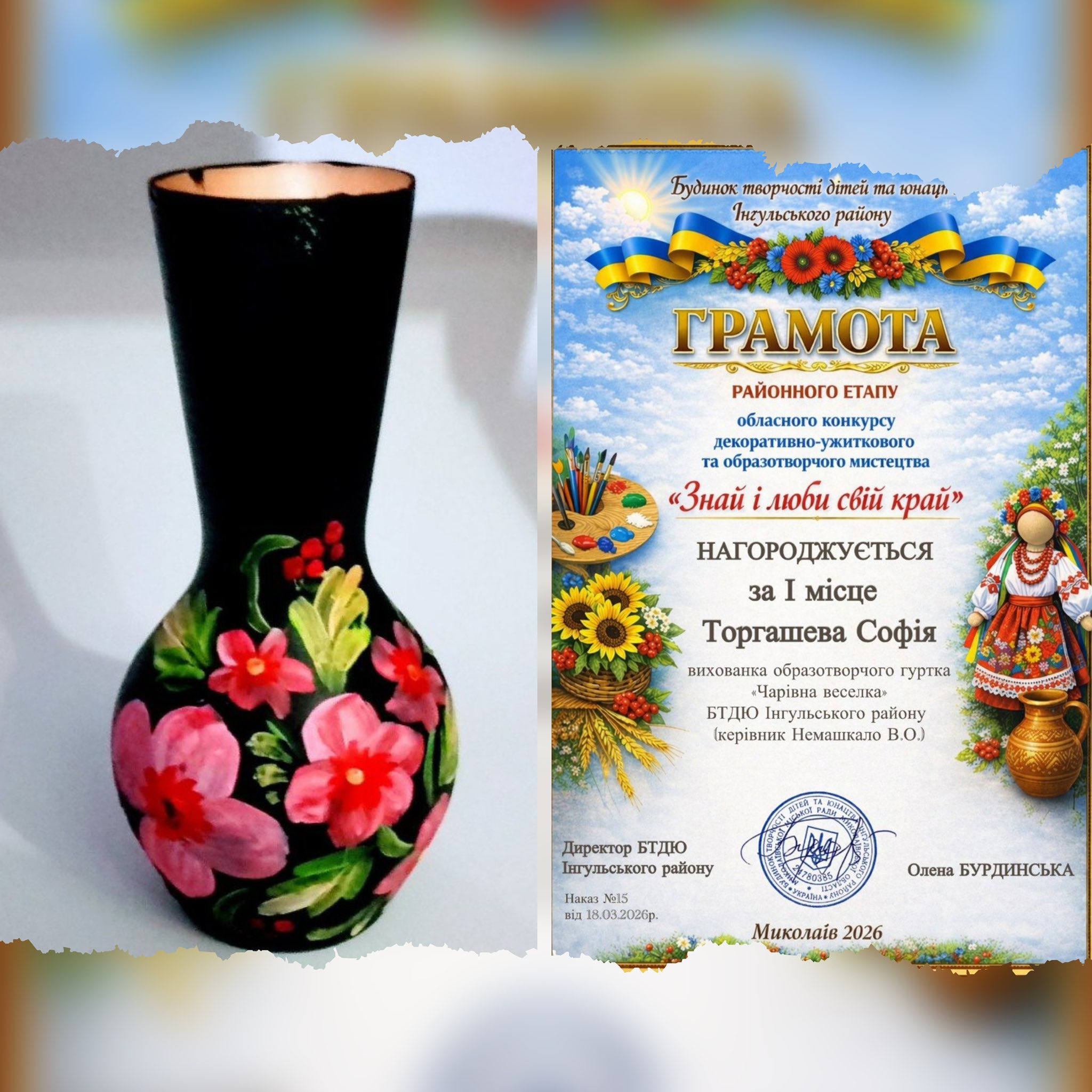 • Торгашева Софія, образотворчий гурток «Чарівна веселка», робота «Чарівний глечик», керівник Немашкало Вікторія Олександрівна