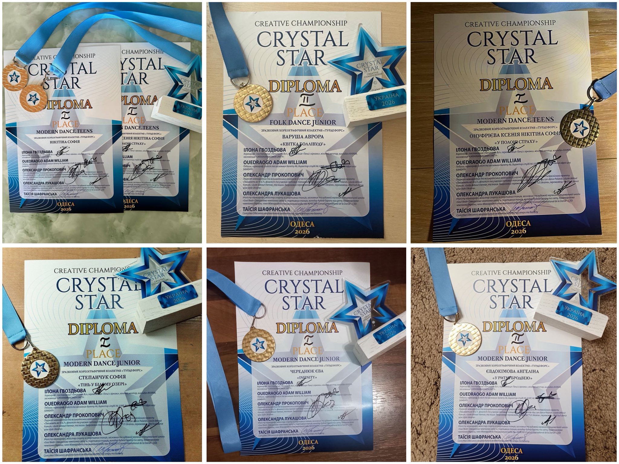 Щиро вітаємо вихованців “Зразкового художнього колективу” гуртка класичного танцю «Турдефорс» (керівники: Перепада А.О., Кленцар І.І.) з блискучими результатами у Міжнародному фестивалі – конкурсі «Crystal Star» (Одеса, 2026)!
