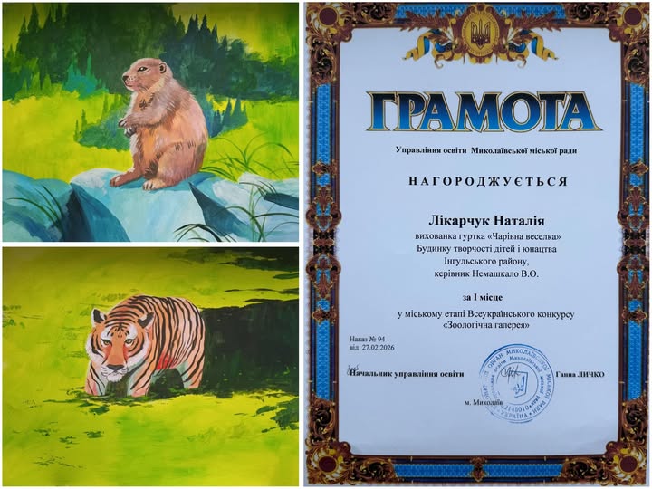 Щиро вітаємо Лікарчук Наталію, вихованку гуртка «Чарівна веселка» Будинку творчості дітей та юнацтва Інгульського району, з почесним І місцем у міському етапі Всеукраїнського конкурсу «Зоологічна галерея»!